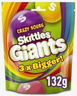 Гиганты в 3 раза больше за обычный Skittles, но с той же хрустящей оболочкой и большим кислым центром внутри!
