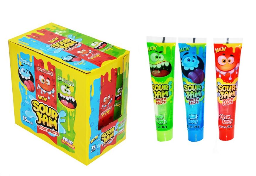 Жидкая карамель гель New Sour paste jam с фруктовым вкусом. Может попасться вкус клубники, яблока или синей малины.