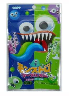 Японская жевательная резинка Marukawa "Монстр", окрашивающая язык в зеленый и синий цвета, со вкусом содовой и лимонада.