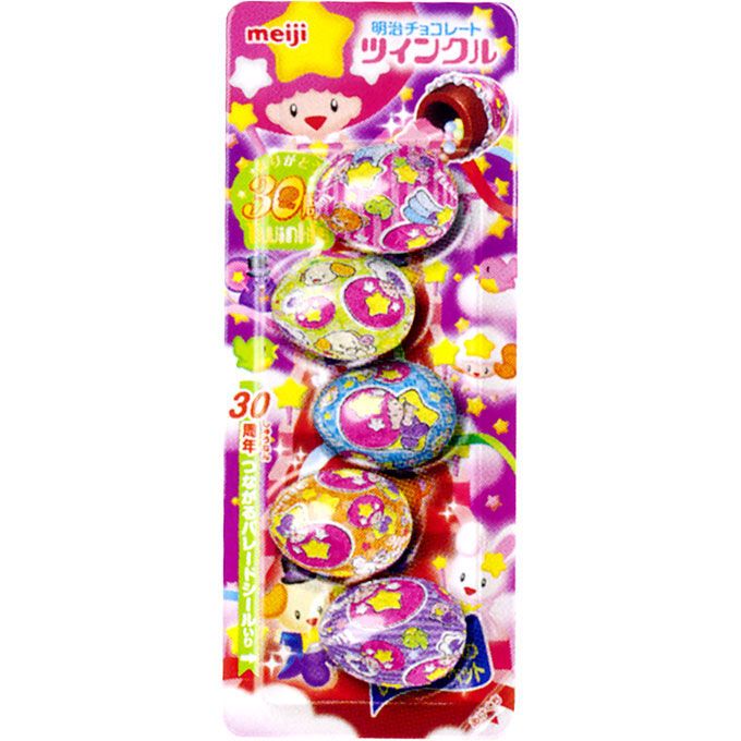 Классные маленькие шоколадные яйца, внутри которых разноцветные молочные конфетки разных форм и размеров - сердечки, шарики и персонажи из истории Твинкл-Чан - доброй маленькой феи из звездной страны. Очень вкусные, дети в восторге. Аутентичный киндер-сюрприз в японском стиле, в упаковке 5 штук, в комплекте - наклейки с Твинкл-Чан.